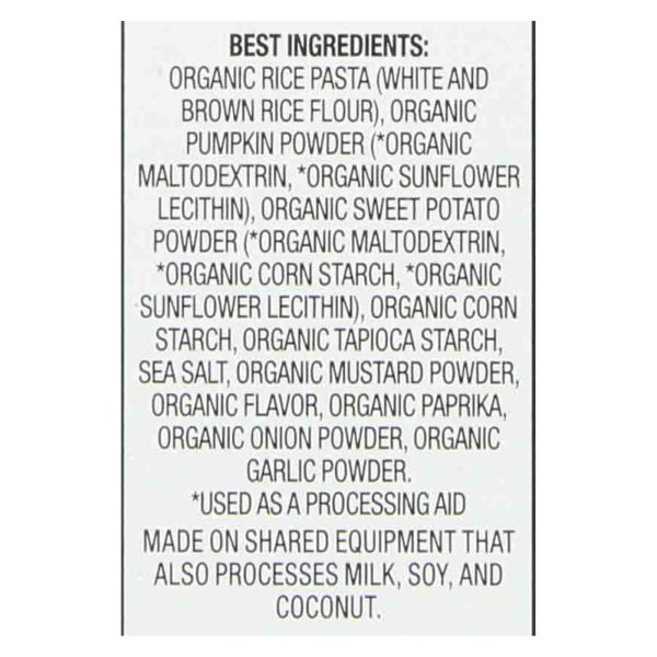 ingredients : organic rice pasta (organic white rice flour, organic brown rice flour);vegan cheddar flavor seasoning (organic rice syrup solids, organic palm oil, sea salt, organic corn starch, organic natural flavor, organic pea protein, lactic acid, sunflower lecithin, organic annatto extract [for color], silicon dioxide [for anticaking], mixed tocopherols [vitamin e] and organic rosemary extract to protect flavor)