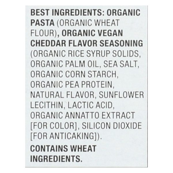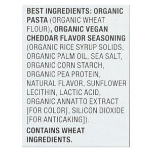 ingredients : best : organic pasta;organic wheat flour;organic vegan cheddar flavor seasoning;organic rice syrup solids;organic palm oil;sea salt;organic corn starch;organic pea protein;natural flavor;sunflower lecithin;lactic acid;organic annatto extract [for color];silicon dioxide [for anticaking]keywords : dairy;food;free;gmo;healthy;lunch;non;organic;snack