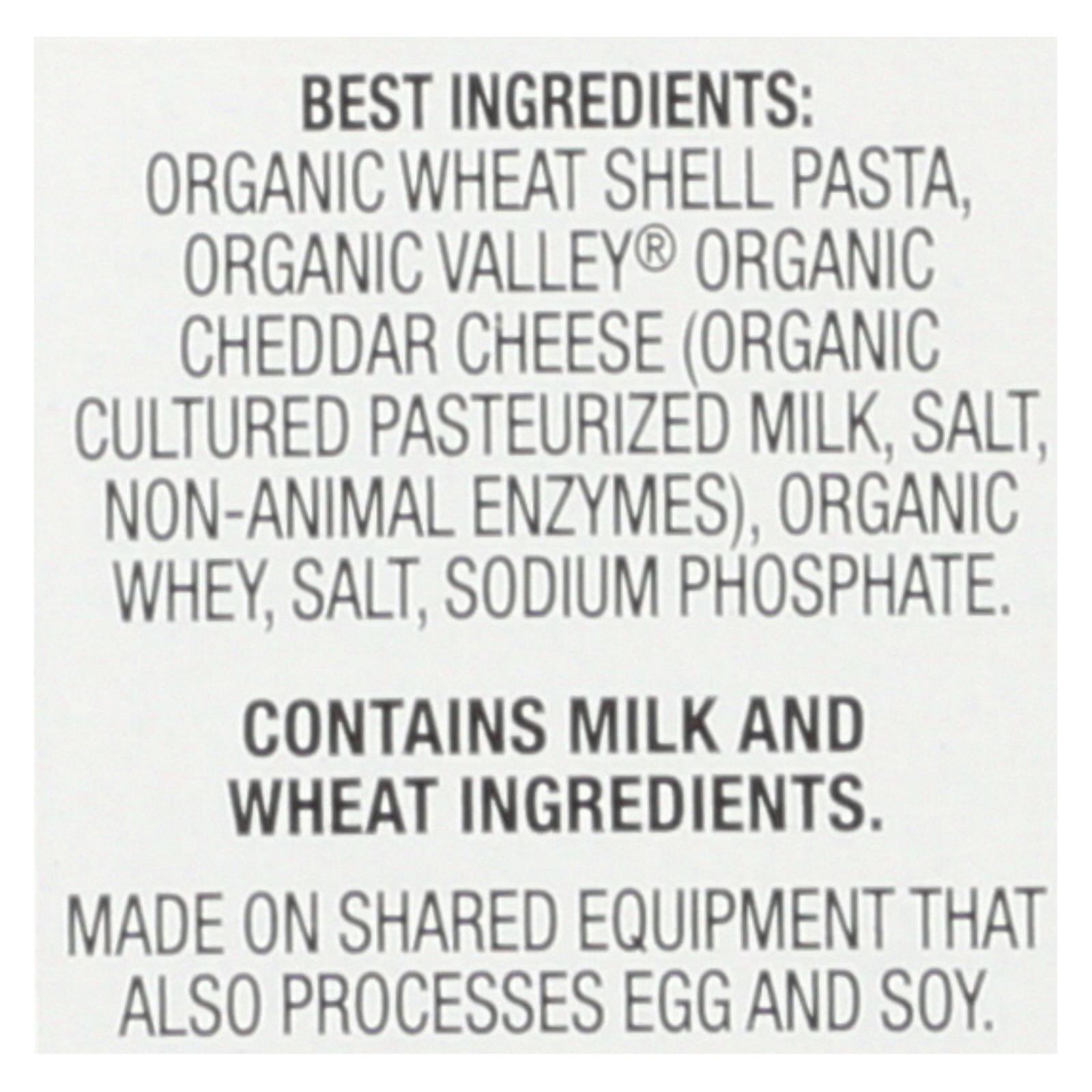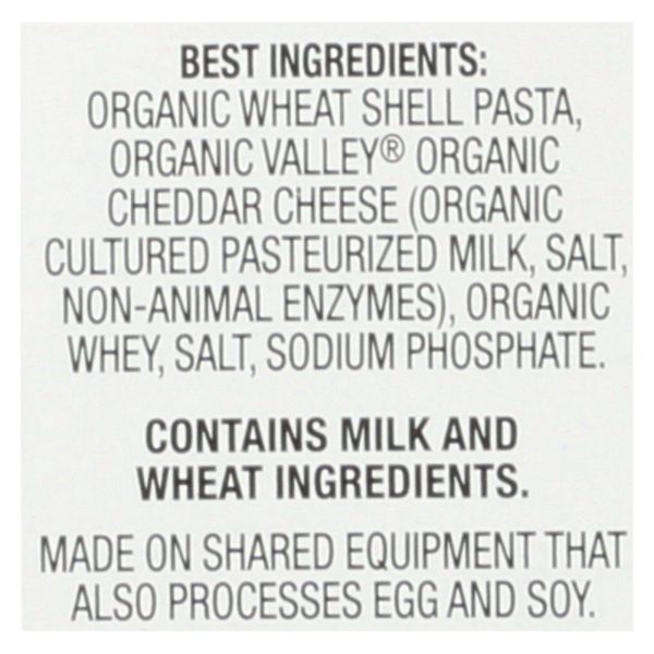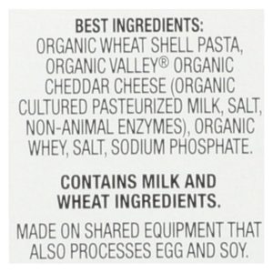 ingredients : organic pasta (organic wheat flour);organic dried cheddar cheese (organic cultured pasteurized milk, salt, non-animal enzymes);organic whey;salt;sodium phosphate;silicon dioxide (for anticaking)