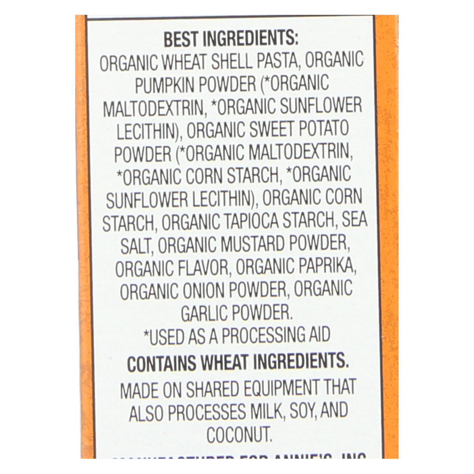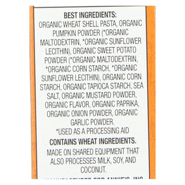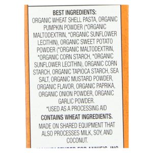 ingredients : best organic wheat shell pasta;organic pumpkin powder (*organic maltodextrin, *organic sunflower lecithin);organic sweet potato powder (*organic maltodextrin, *organic corn starch, *organic sunflower lecithin);organic corn starch;organic tapioca starch;sea salt;organic mustard powder;organic flavor;organic paprika;organic onion powder;organic garlic powder