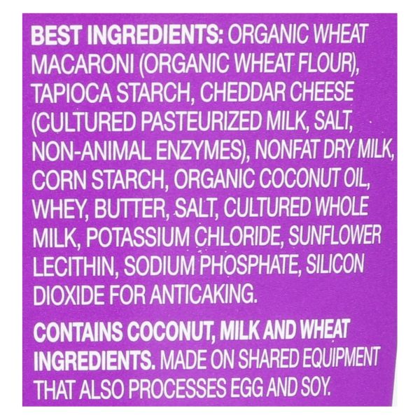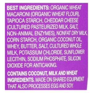 ingredients : best : organic wheat macaroni;organic wheat flour;tapioca starch;cheddar cheese;cultured pasteurized milk;salt;non-animal enzymes;nonfat dry milk;corn starch;organic coconut oil;whey;butter;cultured whole milk;potassium chloride;sunflower lecithin;sodium phosphate;silicon dioxide for anticaking