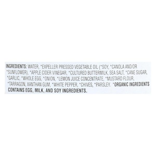 ingredients : water;expeller-pressed canola oil;apple cider vinegar;expeller-pressed soybean oil;sea salt;buttermilk;cane sugar;dried garlic;whole egg;dried onion;lemon juice concentrate;mustard seed;xanthan gum;dried tarragon;skim milk;dried chives;white pepper;dried parsley