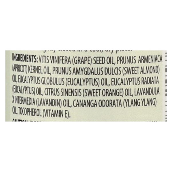 ingredients : vitis vinifera;grape;seed oil;prunus armeniaca;apricot;kernel oil;prunus amygdalus dulcis;sweet almond;oil;eucalyptus globulus;eucalyptus;eucalyptus radiata;citrus sinensis;sweet orange;lavandula x intermedia;lavandin;cananga odorata;ylang ylang;tocopherol;vitamin e