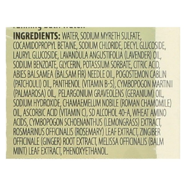 ingredients : water;sodium myreth sulfate;cocamidopropyl betaine;sodium chloride;decyl glucoside;lauryl glucoside;lavandula angustifolia;lavender;oil;sodium benzoate;glycerin;potassium sorbate;citric acid;abies balsamea;balsam fir;needle oil;pogostemon cablin;patchouli;panthenol;vitamin b-5;cymbopogon martinii;palmarosa;pelargonium graveolens;geranium;sodium hydroxide;chamaemelum nobile;roman chamomile;ascorbic acid;vitamin c;sd alcohol 40-a;wheat amino acids;cymbopogon schoenanthus;lemongrass;extract;rosmari