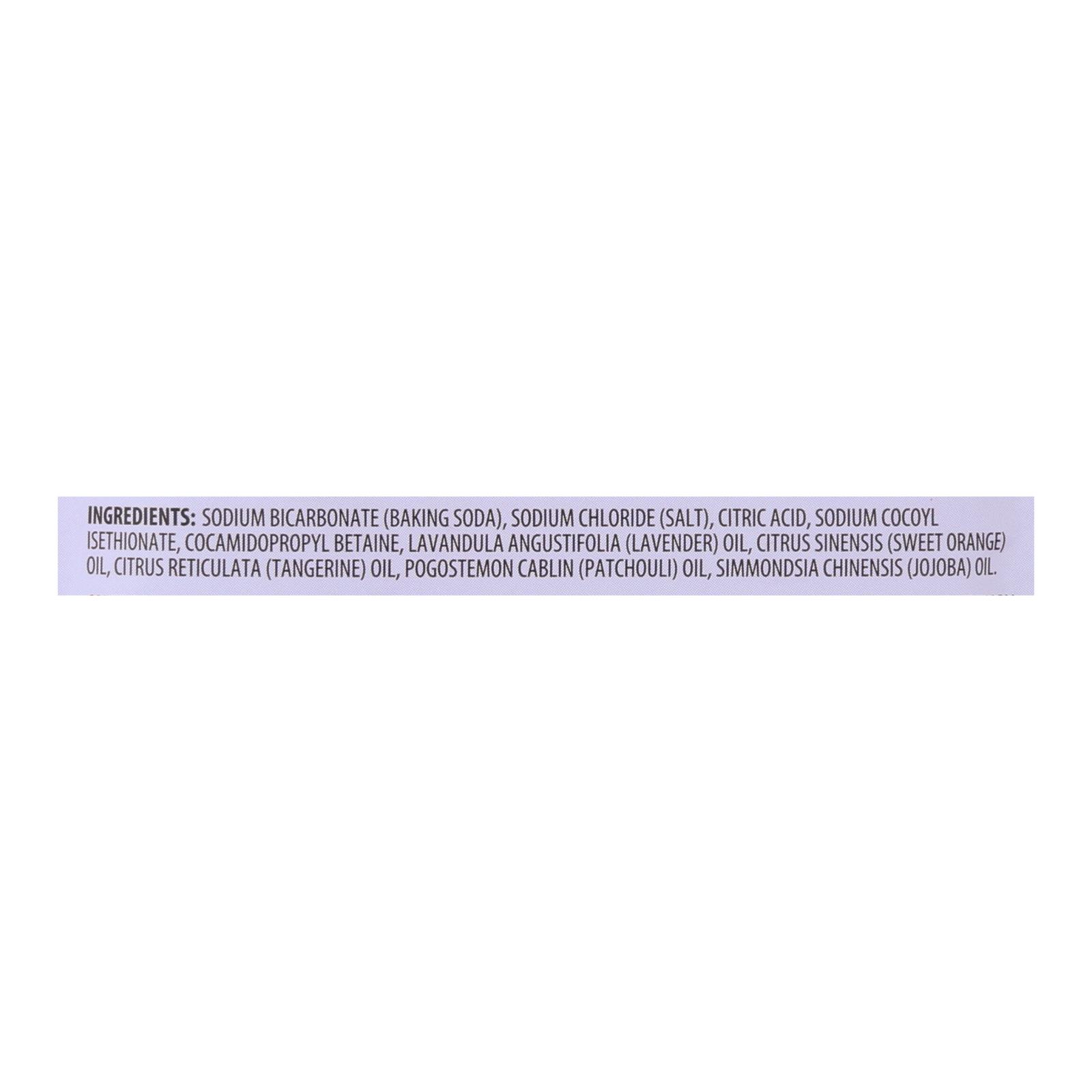 ingredients : sodium bicarbonate;baking soda;sodium chloride;salt;citric acid;sodium cocoyl isethionate;cocamidopropyl betaine;lavandula angustifolia;lavender;oil;citrus sinensis;sweet orange;citrus reticulata;tangerine;pogostemon cablin;patchouli;simmondsia chinensis;jojoba