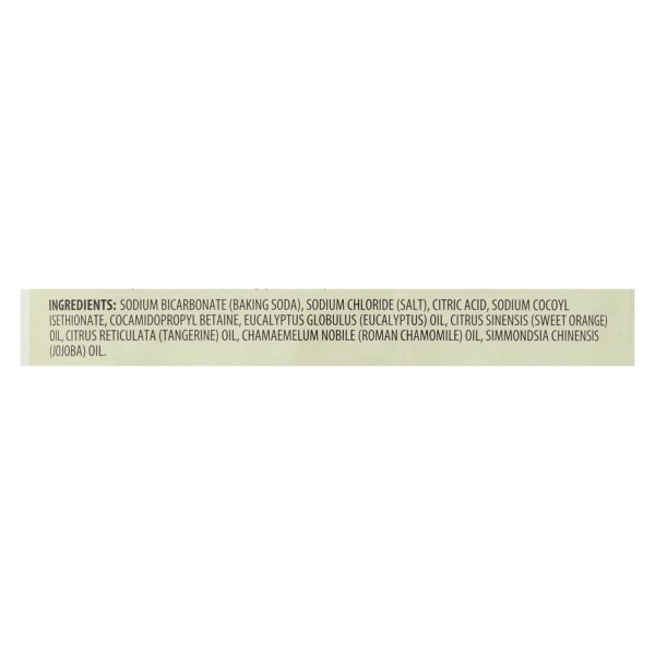ingredients : sodium bicarbonate;baking soda;sodium chloride;salt;citric acid;sodium cocoyl isethionate;cocamidopropyl betaine;eucalyptus globulus;eucalyptus;oil;citrus sinensis;sweet orange;citrus reticulata;tangerine;chamaemelum nobile;roman chamomile;simmondsia chinensis;jojoba