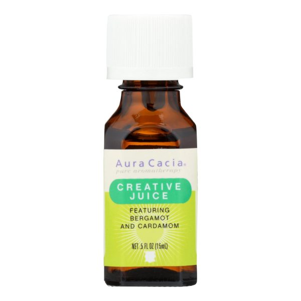 Aura cacia creative juice essential solutions blend is a versatile option for pure aromatherapy. Featuring bergamot and cardamom, this product has beneficial properties for the body. This product is made from a delightful blend of bergamot oil, lemon oil and cardamom seed oil. The suggested uses for this blend are as a brainstorm meeting mist and as a desktop diffuser. Each bottle of aura cacia creative juice essential solutions blend contains 0.5 fl. Oz. Of product. See label for warnings.