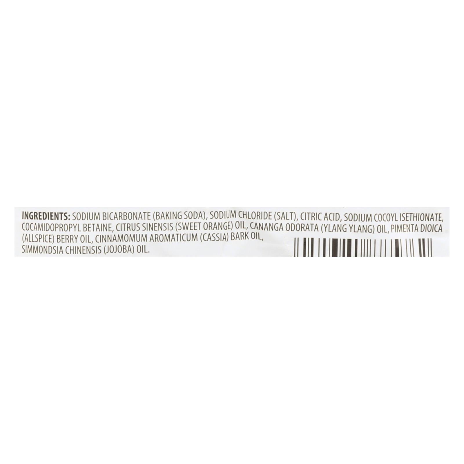 ingredients : sodium bicarbonate;baking soda;sodium chloride;salt;citric acid;sodium cocoyl isethionate;cocamidopropyl betaine;citrus sinensis;sweet orange;oil;cananga odorata;ylang ylang;pimenta dioica;allspice;berry oil;cinnamomum aromaticum;cassia;bark oil;simmondsia chinensis;jojoba