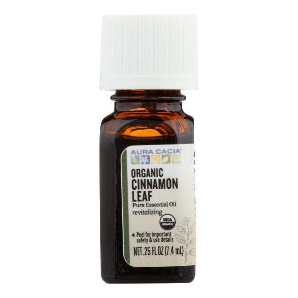 Aura cacia certified organic essential oil, cinnamon leaf is a spicy, clove-like oil that has a revitalizing property. This rich oil is perfect in a mood elevator. This 100% pure essential oil must be diluted properly since it may irritate the skin. Each bottle of aura cacia certified organic essential oil, cinnamon leaf contains 0.25 fl. Oz. Of product. See label for warnings.