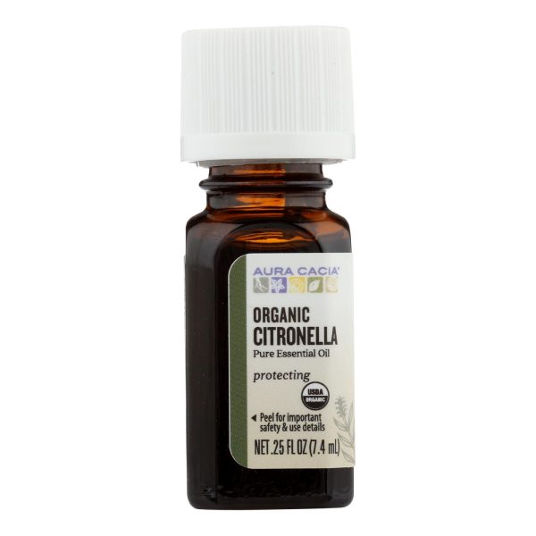 Aura cacia citronella organic essential oil is an herbaceous oil that has protecting properties. Certified organic and originating in sri lanka, this essential oil made from the leaves of the plant. This 100% pure essential oil must be diluted since it may irritate the skin. Each bottle of aura cacia citronella organic essential oil contains 0.25 fl. Oz. Of product. See label for warnings.