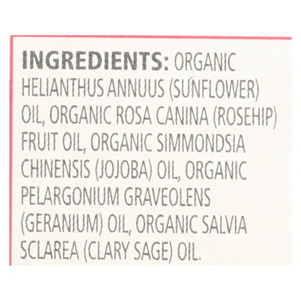 ingredients : organic helianthus annuus;sunflower;oil;organic rosa canina;rosehip;fruit oil;organic simmondsia chinensis;jojoba;organic pelargonium graveolens;geranium;organic salvia sclarea;clary sage;d-alpha tocopheryl acetate;vitamin e acetate