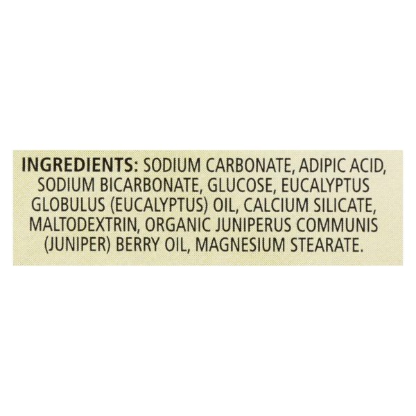 ingredients : sodium carbonate;adipic acid;sodium bicarbonate;glucose;eucalyptus globulus;eucalyptus;oil;calcium silicate;maltodextrin;organic juniperus communis;juniper;berry oil;magnesium stearate