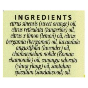 ingredients : citrus sinensis;sweet orange;oil;citrus reticulata;tangerine;citrus x limon;lemon;citrus bergamia;bergamot;lavandula angustifolia;lavender;chamaemelum nobile;roman chamomile;cananga odorata;ylang ylang;santalum spicatum;sandalwood