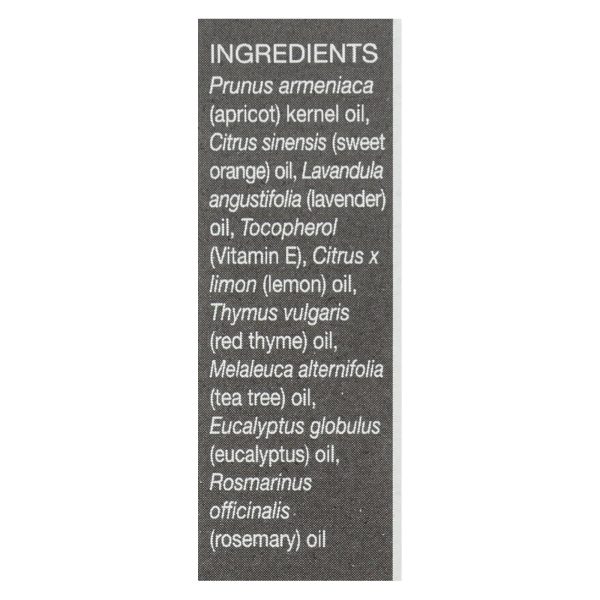 ingredients : prunus armeniaca;apricot;kernel oil;citrus sinensis;sweet orange;oil;lavandula angustifolia;lavender;tocopherol;vitamin e;citrus x limon;lemon;thymus vulgaris;red thyme;melaleuca alternifolia;tea tree;eucalyptus globulus;eucalyptus;rosmarinus officinalis;rosemary