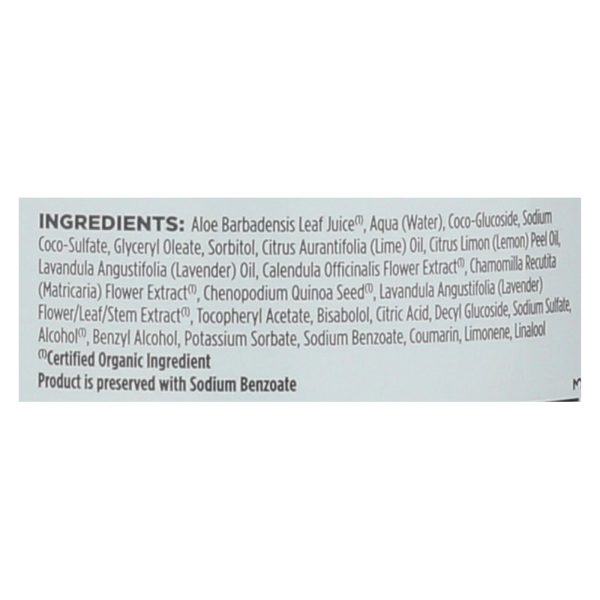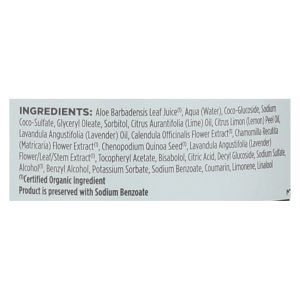 ingredients : aloe barbadensis leaf juice;¹;aqua;water;coco-glucoside;sodium coco-sulfate;glyceryl oleate;sorbitol;citrus aurantifolia;lime;oil;citrus limon;lemon;peel oil;lavandula angustifolia;lavender;calendula officinalis flower extract;chamomilla recutita;matricaria;flower extract;chenopodium quinoa seed;flower/leaf/stem extract;tocopheryl acetate;bisabolol;citric acid;decyl glucoside;sodium sulfate;alcohol;benzyl alcohol;potassium sorbate;sodium benzoate;coumarin;limonene;linalool