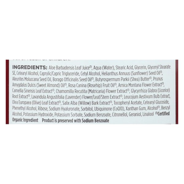 ingredients : aloe barbadensis leaf juice¹;aqua;water;stearic acid;glycerin;glyceryl stearate se;cetearyl alcohol;caprylic/capric triglyceride;cetyl alcohol;helianthus annuus;sunflower;seed oil¹;aleurites moluccana seed oil;borago officinalis seed oil¹;butyrospermum parkii;shea;butter¹;prunus amygdalus dulcis;sweet almond;oil¹;rosa canina;rosehip;fruit oil¹;arnica montana flower extract¹;camellia sinensis leaf extract¹;chamomilla recutita;matricaria;flower extract¹;glycyrrhiza glabra;licorice;root extract¹;la