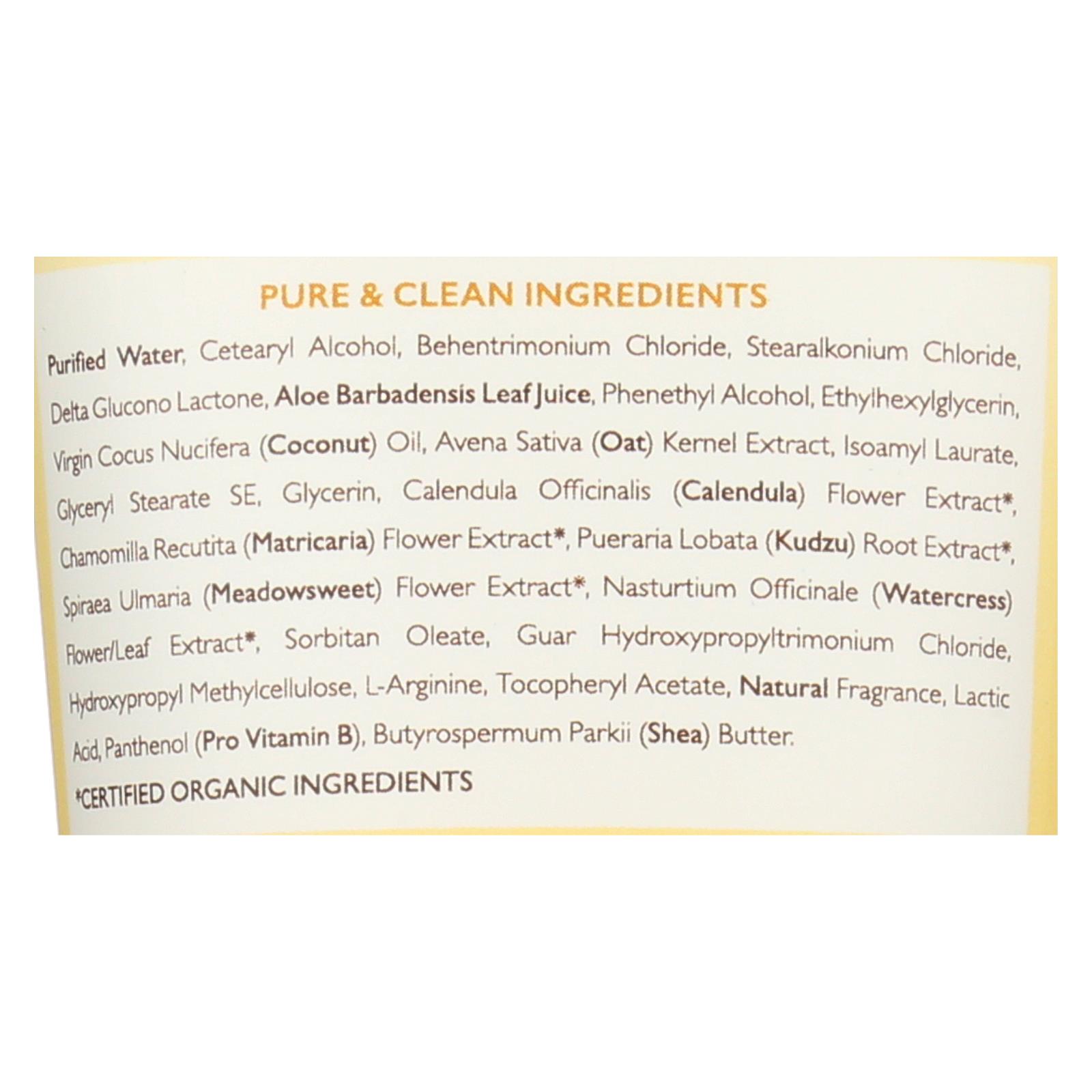 ingredients : pure & clean purified water;cetearyl alcohol;behentrimonium chloride;stearalkonium chloride;delta glucono lactone;aloe barbaensis leaf juice;phenethyl alcohol;ethylhexylglycerin;virgin cocus nucifera;coconut;oil;avena sativa;oat;kernel extract;isoamyl laurate;glyceryl stearate se;glycerin;calendula officinalis;calendula;flower extract;chamomilla recutita;matricaria;pueraria lobata;kudzu;root extract;spiraea ulmaria;meadowsweet;nasturtium officinale;watercress;flower/leaf extract;sorbitan ol