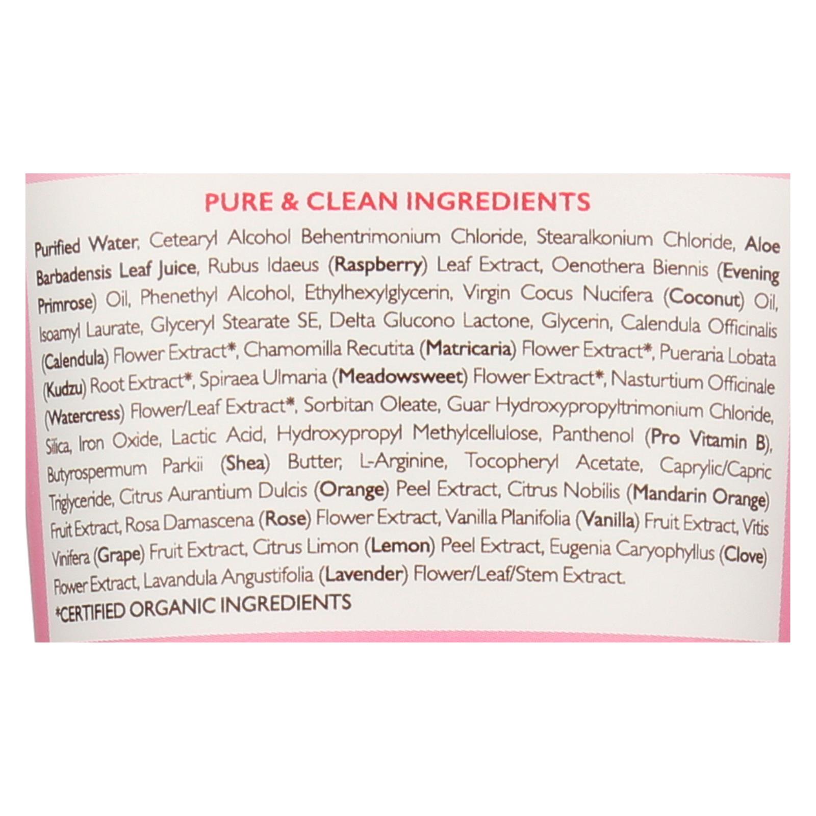 ingredients : purified water;cetearyl alcohol behentrimonium chloride;stearalkonium chloride;aloe barbadensis leaf juice;rubus idaeus;raspberry;leaf extract;oenothera biennis;evening primrose;oil;phenethyl alcohol;ethylhexylglycerin;virgin cocus nucifera;coconut;isoamyl laurate;glyceryl stearate se;delta glucono lactone;glycerin;calendula officinalis;calendula;flower extract;chamomilla recutita;matricaria;pueraria lobata;kudzu;root extract;spiraea ulmaria;meadowsweet;nasturtium officinale;watercress;flower/le