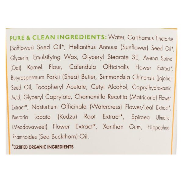 ingredients : water;carthamus tinctorius;safflower;seed oil;helianthus annuus;sunflower;glycerin;emulsifying wax;glyceryl stearate se;avena sativa;oat;kernel flour;calendula officinalis flower extract;butyrospermum parkii;shea;butter;simmondsia chinensis;jojoba;tocopheryl acetate;cetyl alcohol;caprylhydroxamic acid;glyceryl caprylate;chamomilla recutita;matricaria;flower extract;nasturtium officinalis;watercress;flower/leaf extract;pueraria lobata;kudzu;root extract;spiraea ulmaria;meadowsweet;xanthan gum;hip