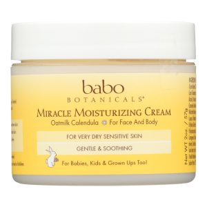 Babo botanicals oatmilk calendula miracle moisturizing cream is made with purified water, aloe leaf juice, virgin coconut oil, shea butter, cocoa seed butter, vegetable glycerin, calendula flower extract, chamomile flower extract, meadowsweet flower extract, cedarwood oil, bergamot fruit extract, vanilla extract and vitamin e. Each 2 oz. Tub contains our moisturizing cream, which soothes and comforts very dry or sensitive skin. See label for warnings and risks.
