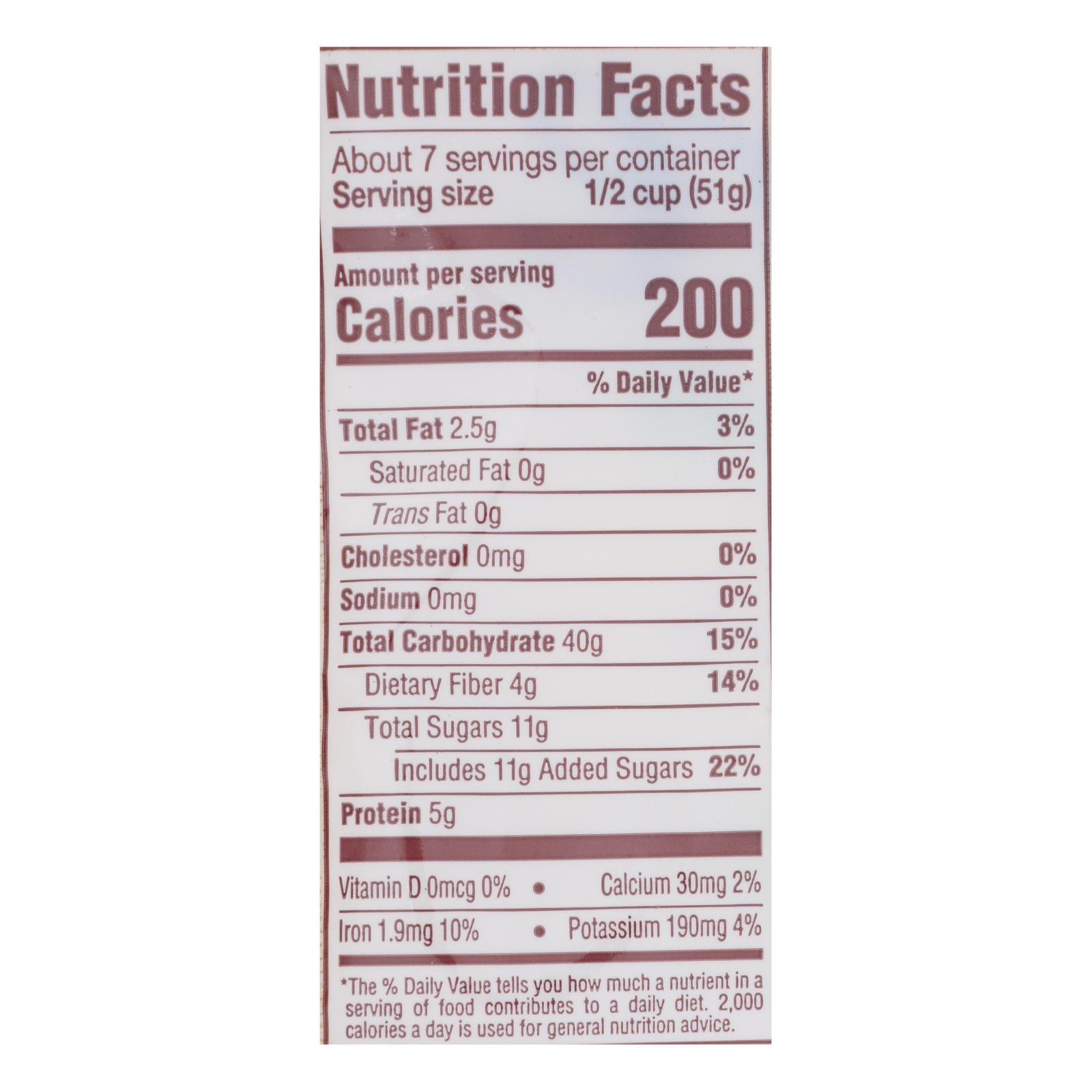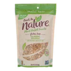 Back to nature classic granola offers an excellent source of whole grains in a delicious snack. We combined rolled oats with fruit juice concentrates to bring you a tasty food you can enjoy any time of the day. Pour in a bowl of milk for a healthy breakfast, or use this granola as a topping for yogurt or ice cream. Combine it with nuts and other ingredients for a yummy trail mix on the go. This 12.5 oz. Bag contains 5 g. Of protein and 4 g. Of dietary fiber per serving for a treat that is as nutritious as it is flavorful.