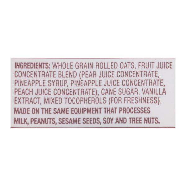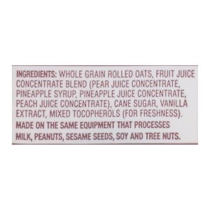 ingredients : whole grain rolled oats;fruit juice concentrate blend;pear juice concentrate;pineapple syrup;pineapple juice concentrate;peach juice concentrate;cane sugar;vanilla extract;mixed tocopherols;for freshness