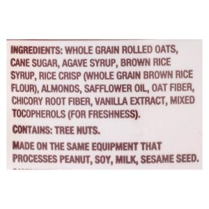ingredients : whole grain rolled oats;cane sugar;organic agave syrup;brown rice syrup;brown rice crisp;brown rice;sea salt;almonds;safflower oil;oat fiber;chicory root fiber;vanilla extract;mixed tocopherols;for freshness