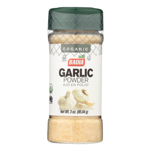 Usda organic. Quality assurance international. Certified organic by: quality assurance international. Gluten free. Garlic is one of the most useful and appetizing condiments due to tis distinctive flavor and its healthy virtues. It is the ideal accompaniment to pastas, rice, poultry, beef, seafood and vegetables. Each 1/8 teaspoon of badia garlic powder equals 1 clove of fresh garlic. Visit our website www.badiaspices.com. For nutritional information contact us. Please recycle! packed in usa.