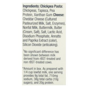 ingredients : chickpea pasta: chickpeas;tapioca;pea protein;xanthan gum cheese: cheddar cheese;cultured pasteurized milk;salt;enzymes;nonfat milk;buttermilk;butter;cream;lactic acid;disodium phosphate;annatto and paprika extract;color;silicon dioxide;anticaking