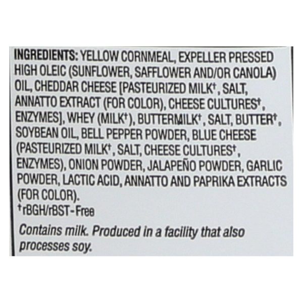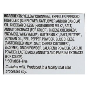 ingredients : yellow corn meal;expeller pressed high oleic oil;sunflower;safflower and/or canola;cheddar cheese;pasteurized milk;salt;annatto extract [for color];cheese cultures;enzymes;whey;buttermilk;butter;green bell pepper;blue cheese;onion powder;jalapeno pepper;garlic powder;lactic acid;annatto and paprika extracts;for color;tocopherols;antioxidants to preserve freshness