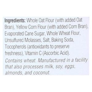 ingredients : whole grain oats;whole grain wheat flour;corn flour;cane sugar;unsulfured molasses;oat fiber;salt;baking soda;vitamin c;ascorbic acid;tocopherols;antioxidants to maintain freshness