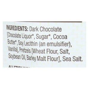 ingredients : dark chocolate [chocolate liquor*, sugar*, cocoa butter*, soy lecithin (an emulsifier), vanilla];pretzels [wheat flour, salt, soybean oil, barley malt flour];sea salt