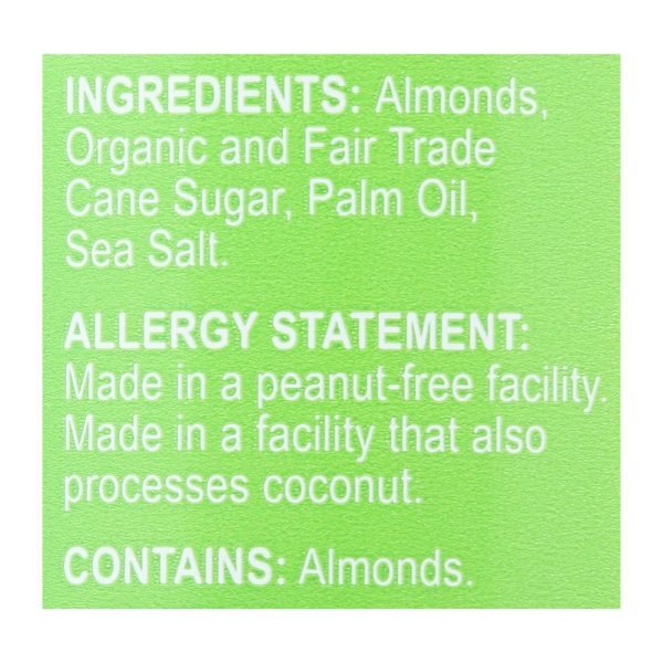ingredients : almonds;organic and fair trade cane sugar;palm oil;sea salt