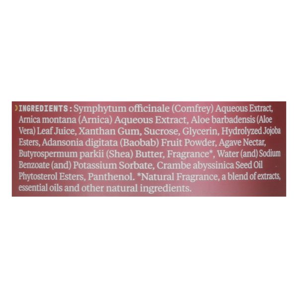 ingredients : symphytum officinale (comfrey) aqueous extract;arnica montana (arnica) aqueous extract;aloe barbadensis (aloe vera) leaf juice;xanthan gum;sucrose;glycerin;hydrolyzed jojoba esters;adansonia digitata (baobab) fruit powder;agave nectar;butyrospermum parkii (shea) butter;fragrance;water (and) sodium benzoate (and) potassium sorbate;crambe abyssinica seed oil phytosterol esters;panthenol