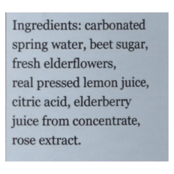 ingredients : carbonated spring water;beet sugar;fresh steeped elderflowers;pressed lemon juice;citric acid;elderberry juice from concentrate;rose extract