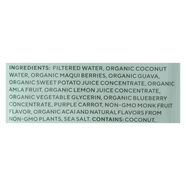 ingredients : filtered water;organic coconut water;organic maqui berries;organic guava;organic sweet potato juice concentrate;organic amla fruit;organic lemon juice concentrate;organic vegetable glycerin;organic blueberry concentrate;purple carrot;non-gmo monk fruit flavor;organic acai and natural flavors from non-gmo plants;sea salt