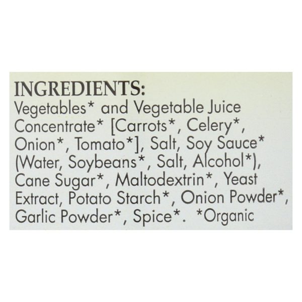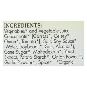ingredients : vegetables* and vegetable juice concentrate* [carrots*, celery*, onion*, tomato*];salt;soy sauce* (water, soybeans*, salt, alcohol*);cane sugar;maltodextrin;yeast extract;potato starch;onion powder;garlic powder;spice