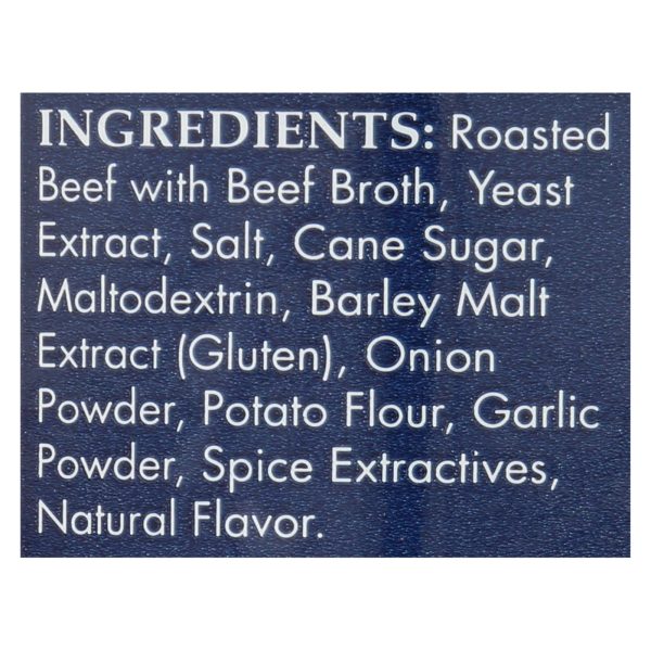 ingredients : roasted beef with beef broth;yeast extract;salt;cane sugar;maltodextrin;barley malt extract (gluten);onion powder;potato flour;organic garlic powder;natural flavor;spice extractives