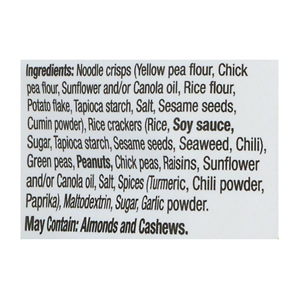Fragrant and flavorful spices contrast with a delicious mix of wholesome crunchy nibbles, mini rice crackers, garden peas, peanuts, chickpeas and succulent sultanas.