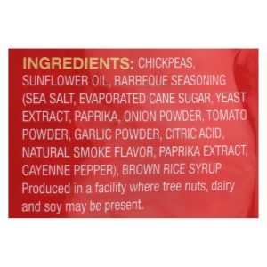 ingredients : chickpeas;expeller pressed high oleic sunflower oil;bbq seasoning (sea salt, evaporated cane sugar, yeast extract, paprika, onion powder, tomato powder, garlic powder, citric acid. Natural smoke flavor, paprika extract, spice) cane sugar;salt