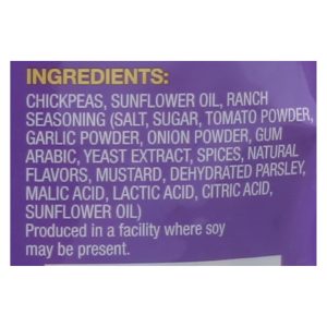 ingredients : chickpeas;sunflower oil;ranch seasoning;salt;sugar;tomato powder;garlic powder;onion powder;gum arabic;yeast extract;spices;natural flavors mustard;dehydrated parsley;malic acid;lactic acid;citric acid