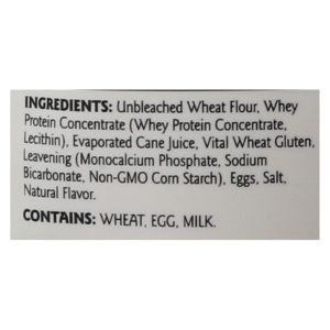 ingredients : unbleached wheat flour;whey protein concentrate (whey protein concentrate, lecithin);evaporated cane sugar;vital wheat gluten;leavening (monocalcium phosphate, sodium bicarbonate, non-gmo corn starch);eggs;salt;natural flavor