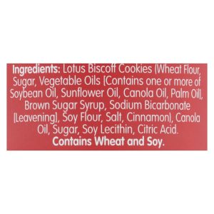 ingredients : lotus biscoff cookies;wheat flour;sugar;vegetable oils [contains one or more of soybean oil;sunflower oil;canola oil;palm oil];brown sugar syrup;sodium bicarbonate [leavening];soy flour;salt;cinnamon;soy lecithin;citric acid