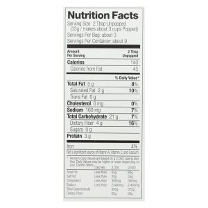 Enjoy the “movie theatre” taste of natural butter flavor black jewell microwave popcorn. A convenient way to enjoy a fun and healthy snack. Pops pure white, contains protective antioxidants, 100 percent natural grain, gluten free, cholesterol free and non-gmo verified.