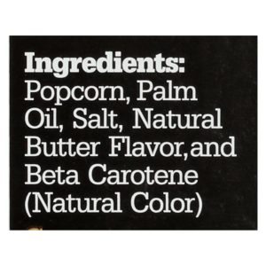 ingredients : non-gmo popcorn;palm oil;sea salt;natural butter flavor;and beta carotene (natural color)