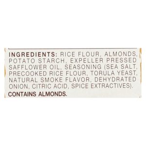 ingredients : rice flour;almonds;potato starch;safflower oil;seasoning (sea salt, precooked rice flour, torula yeast, natural smoke flavor, dehydrated onion, citric acid, spice extractives)