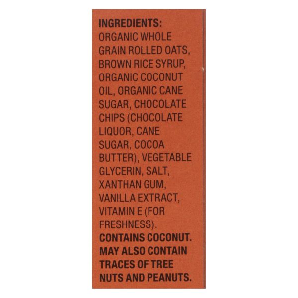 ingredients : organic whole grain rolled oats;brown rice syrup;organic coconut oil;organic cane sugar;chocolate chips;chocolate liquor;cane sugar;cocoa butter;vegetable glycerin;salt;xanthan gum;vanilla extract;vitamin e;for freshness
