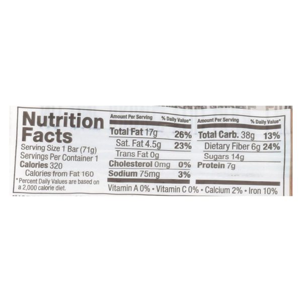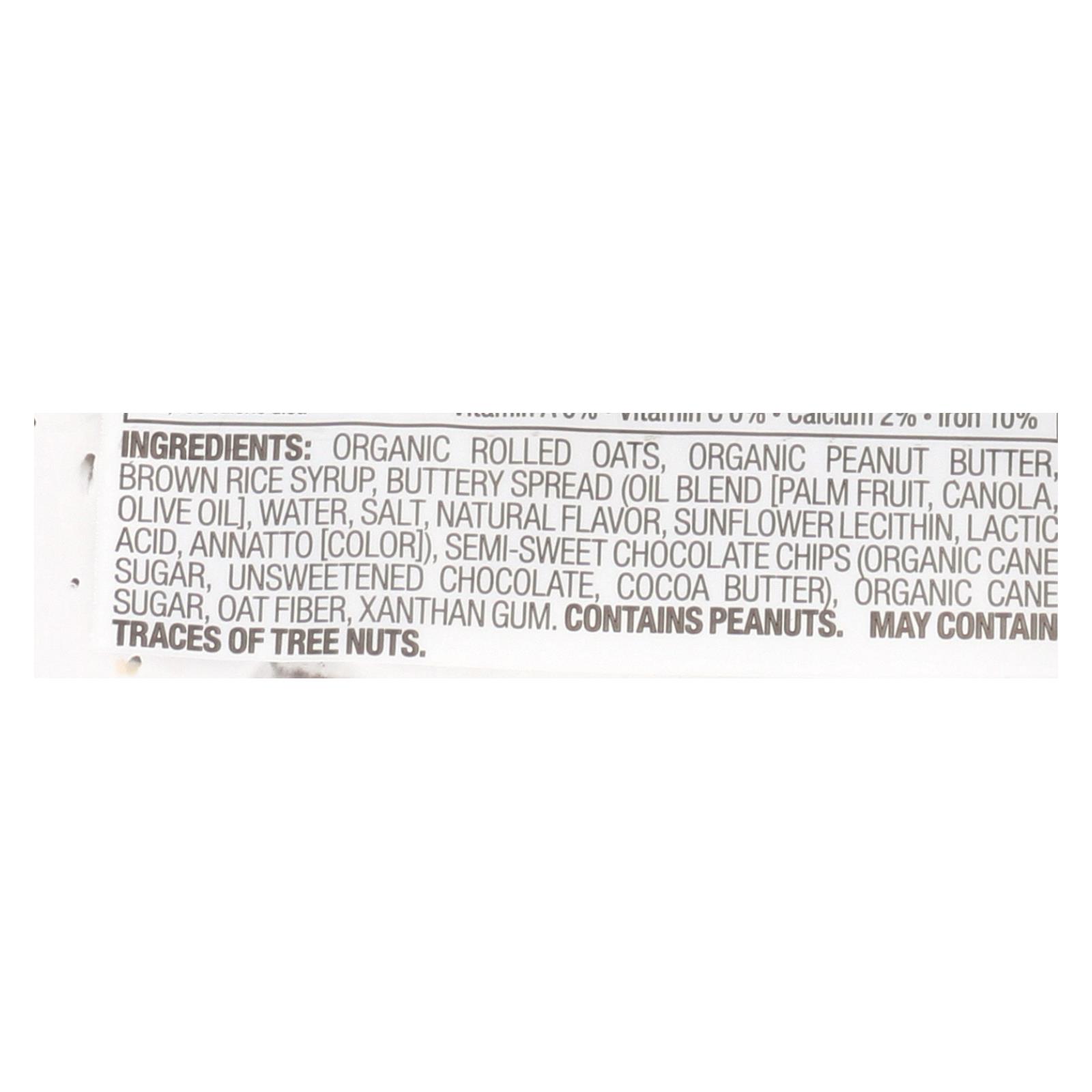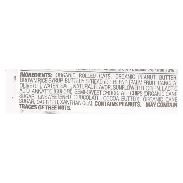 ingredients : whole grain rolled oats;peanut butter;brown rice syrup;chocolate chips (sugar, chocolate liquor, cocoa butter, vanilla extract);cane sugar;coconut oil;oat fiber;vegetable glycerin;xanthan gum;sea salt;vitamin e (for freshness)