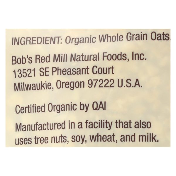 Usda organic. Certified organic by qai. 100% whole grain: 45 g or more per serving. 100% of the grain is whole grain. Wholegrainscouncil.org. Good source of fiber. Sourced non-gmo pledge: for more information on our sourced non-gmo pledge, visit bobsredmill.com/non-gmo. An employee-owned company. To your good health. – bob moore. World’s best oatmeal. Our quick cooking rolled oats are milled from the highest quality farm-fresh oats in the world. Each oat is rolled thin to shorten the cooking time, so a tasty bowl of whole grain oatmeal is just minutes away. You can see our quality. Dear friends, what we eat in the morning makes all the difference in how we get through the rest of the day. A bowl of nutritious whole grain oatmeal starts you off right and keeps your hunger at bay throughout the morning. In my view, no food on earth is better! to your good health, bob moore. Bobsredmill.com. Bobsredmill.com/oatmeal. Bobsredmill.com/non-gmo. Wholegrainscouncil.org. For information and recipes, visit bobsredmill.com.