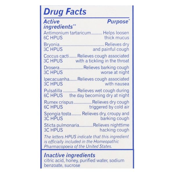 ingredients : active ** antimonium tartaricum 6c hpus purpose* helps loosen thick mucus bryonia 3c hpus purpose* relieves dry and painful cough coccus cacti 3c hpus purpose* relieves cough associated with a tickling in the throat drosera 3c hpus purpose* relieves barking cough worse at night ipecacuanha 3c hpus purpose* relieves cough associated with nausea pulsatilla 6c hpus purpose* relieves wet coughing during the day becoming dry at night rumex crispus 6c hpus purpose* relieves dry cough triggered b
